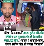 नवादा (बिहार) 13 दिसंबर 2025। नवादा की दिल दहला देने वाली मारपीट और मौत का मामला अब और पेचीदा होता जा रहा है। एक तरफ़ मृतक कपड़ा व्यापारी मोहम्मद अतहर हुसैन की मौत के बाद उसकी पत्नी शबनम परवीन ने थाने में संगीन आरोपों के साथ बड़ा मुकदमा दर्ज कराया है, तो दूसरी ओर पुलिस रिकॉर्ड में यह भी दर्ज है कि घटना वाले दिन ही अतहर हुसैन के ख़िलाफ़ चोरी का एक अलग मामला दर्ज किया गया था। दो मुकदमों के बीच अब सवाल यह उठ रहा है कि क़ातिल कौन और क़सूरवार कौन?