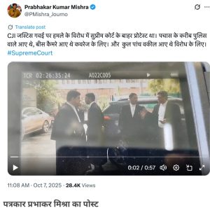 पत्रकार प्रभाकर कुमार मिश्रा ने इस प्रदर्शन से जुड़ा एक वीडियो X पर शेयर किया है। प्रभाकर कुमार मिश्रा ने लिखा है, “CJI जस्टिस गवई पर हमले के विरोध में सुप्रीम कोर्ट के बाहर प्रोटेस्ट था। 50 के करीब पुलिस वाले आए थे, 20 कैमरे आए थे कवरेज के लिए। और कुल पाँच वकील आए थे विरोध के लिए।”