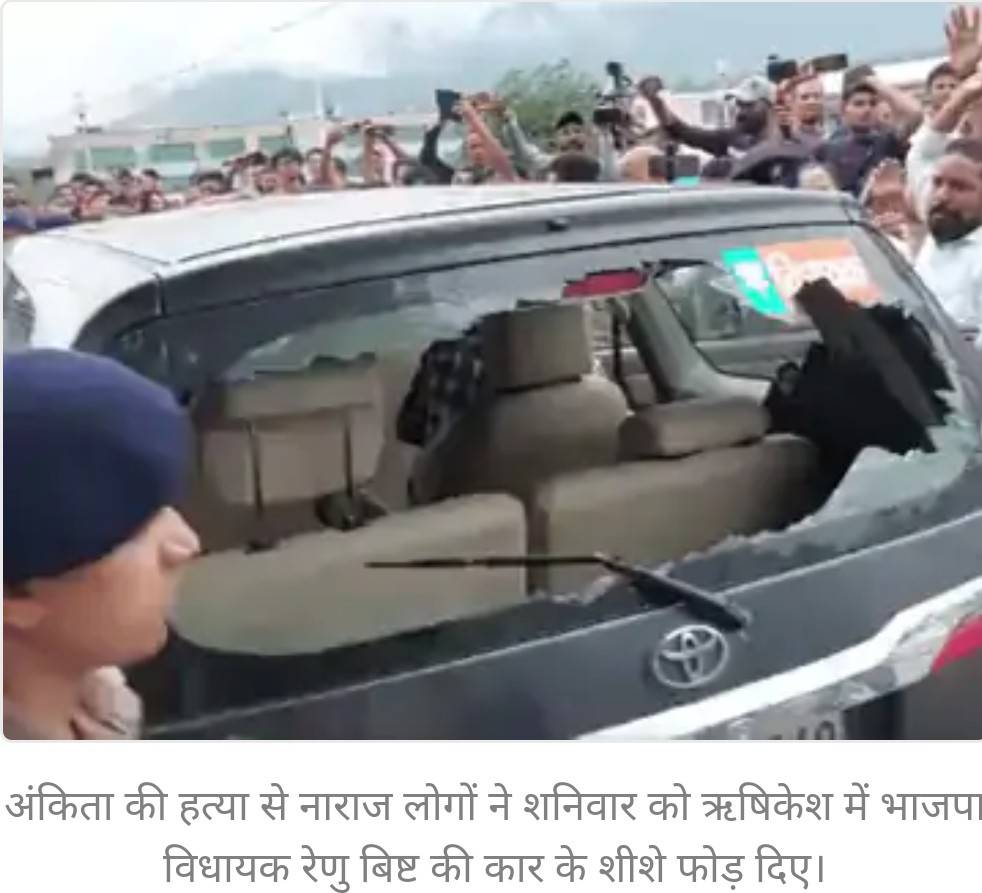 BJP विधायक रेणु बिष्ट की कार, जिसके कांच भीड़ ने तोड़ दिए।