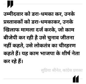 नई दिल्ली 04 मई 2024: लोकसभा चुनाव में कांग्रेस की परेशानी खत्म होने का नाम ही नहीं ले रही है। पहले सूरत, फिर इंदौर और अब पुरी। कांग्रेस के उम्मीदवार चुनाव से पहले मैदान से पीछे हट जा रहे हैं। अब पुरी से कांग्रेस उम्मीदवार सुचारिता मोहंती ने पार्टी का टिकट लौटा दिया है। मोहंती का कहना है कि उनके पास चुनाव लड़ने के लिए पैसे नहीं हैं। लोकसभा में बिना लड़े ही लोकसभा चुनाव में कांग्रेस की यह तीसरी बड़ा झटका है। दूसरी तरफ कांग्रेस इन घटनाक्रमों को लेकर बीजेपी पर लोकतंत्र का चीरहरण करने का आरोप लगा रही है। कांग्रेस प्रवक्ता सुप्रिया श्रीनेत कह चुकी हैं कि बीजेपी के शीर्ष नेता विपक्षी उम्मीदवारों को डराने-धमकाने और मामले दर्ज करवाने का काम कर रहे हैं। उम्मीदवारों का पर्चा खारिज होने, टिकट लौटाने और नाम वापस लेने को लेकर कांग्रेस बीजेपी को जिम्मेदार ठहरा रही है। सूरत के संदर्भ में कांग्रेस का कहना था कि बीजेपी के मजबूत गढ़ में भी प्रधानमंत्री नरेन्द्र मोदी इतना घबराए और डरे हुए क्यों हैं? पार्टी महासचिव जयराम रमेश ने यह आरोप भी लगाया कि सूरत के बाद इंदौर लोकसभा क्षेत्र में कांग्रेस के उम्मीदवारों को नामांकन वापस लेने के लिए डराया और धमकाया गया।