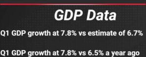 भारत की जीडीपी ग्रोथ दर पहली तिमाही में 7.8% रही,जो देश की तेजी से बढ़ती आर्थिक ताकत को दर्शाती है। कृषि क्षेत्र ने पहली तिमाही में 3.7 प्रतिशत की ग्रोथ दर्ज की,जो पिछले साल की तुलना में काफी बेहतर है। सर्विस सेक्टर की ग्रोथ दर 9.3 प्रतिशत रही,जो उम्मीद से अधिक और पिछले वर्ष से बेहतर प्रदर्शन दिखाती है