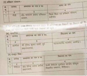 *राजभवन देहरादून 05 सितम्बर, 2024*‘‘शैलेश मटियानी राज्य शैक्षिक पुरस्कार’’ सम्मान समारोह में राज्यपाल लेफ्टिनेंट जनरल गुरमीत सिंह (सेवा निवृत्त), मुख्यमंत्री पुष्कर सिंह धामी और शिक्षा मंत्री डॉक्टर धन सिंह रावत ने वर्ष 2023 में शैलेश मटियानी राज्य शैक्षिक पुरस्कारों को चयनित शिक्षक एवं शिक्षिकाओं को सम्मानित किया। शिक्षक दिवस के अवसर पर राजभवन में आयोजित सम्मान समारोह में वर्ष 2023 के लिए चयनित 19 शिक्षकों एवं शिक्षिकाओं को पुरस्कार प्रदान किए गए है। *(सूची संलग्न)*
