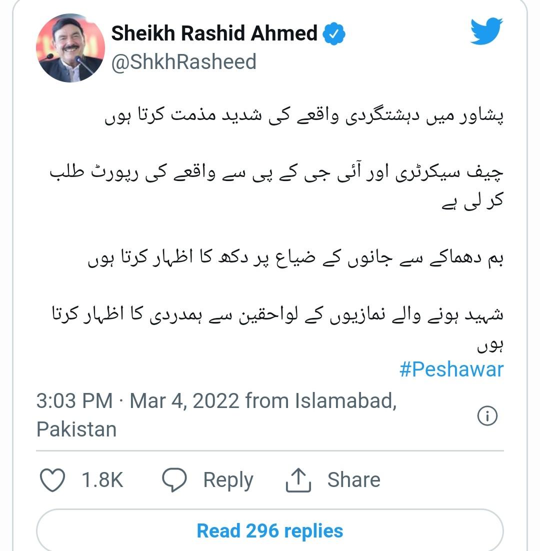 पाकिस्तान के गृह मंत्री शेख़ राशिद अहमद ने ट्वीट करके धमाके की निंदा की है.