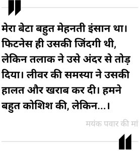 मयंक पवार की मौत को लेकर उनकी मां रजनी पवार ने चौंकाने वाली जानकारी दी है कि मयंक लिवर की गंभीर समस्या से जूझ रहे थे, जो उन्हें तलाक बाद हुई थी। वह डिप्रेशन और अकेलेपन से जूझे जिससे और हालत बिगड़ती चली गई।