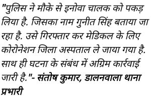 “पुलिस ने मौके से इनोवा चालक को पकड़ लिया है. जिसका नाम गुनीत सिंह बताया जा रहा है. उसे गिरफ्तार कर मेडिकल के लिए कोरोनेशन जिला अस्पताल ले जाया गया है. साथ ही घटना के संबंध में अग्रिम कार्रवाई जारी है.”- संतोष कुमार, डालनवाला थाना प्रभारी