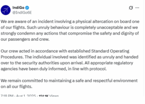 घटना पर प्रतिक्रिया देते हुए इंडिगो एयरलाइंस ने एक आधिकारिक बयान जारी कर आरोपित की हरकत की कड़ी निंदा की है. इंडिगो ने कहा कि हमारी एक उड़ान में हुई इस झड़प की घटना की हमें जानकारी है. ऐसा अनुशासनहीन व्यवहार पूरी तरह से अस्वीकार्य है और हम ऐसे किसी भी कृत्य की कड़ी निंदा करते हैं जो हमारे यात्रियों और क्रू की सुरक्षा और गरिमा से समझौता करता हो.