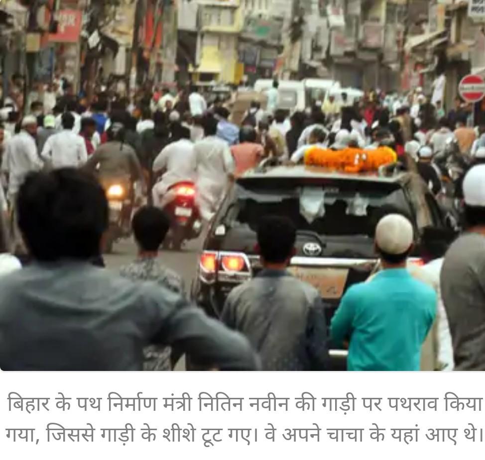 बिहार के पथ निर्माण मंत्री नितिन नवीन की गाड़ी पर पथराव किया गया, जिससे गाड़ी के शीशे टूट गए। वे अपने चाचा के यहां आए थे।