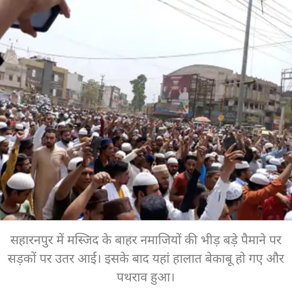 सहारनपुर में नमाज के बाद भीड़ जामा मस्जिद से पैदल घंटाघर पहुंचज्ञहंगामा करने लगी। पुलिस ने भीड़ वापस की तो कई दुकानों पर पथराव हो गया। इसमें एक युवक पत्थर से चोटिल हो गया। पुलिस ने लाठीचार्ज कर भीड़ खदेड़ी। यहां कई को हिरासत में लिया गया है।