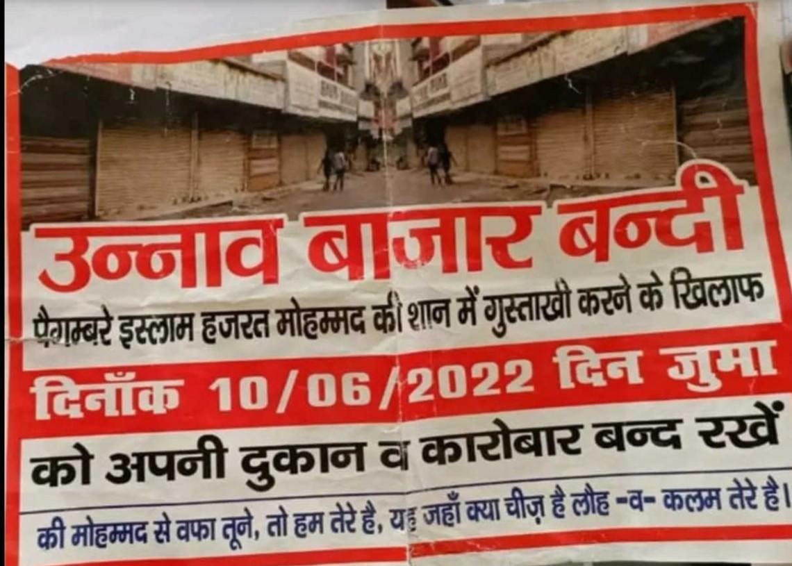 कासगंज के गंजडुंडवारा में मुस्लिम समुदाय ने व्यापारिक प्रतिष्ठान बंद रखे। मैनपुरी में बंद कई दुकानों पर नुपुर शर्मा को जेल भेजने की मांग के पर्चे चिपके थे। सम्भल में भी मुसलमानों ने अपनी दुकानें बंद रखीं। वाराणसी की दाल मंडी, नई सड़क और मदनपुरा क्षेत्र में दुकानें बंद रहीं।