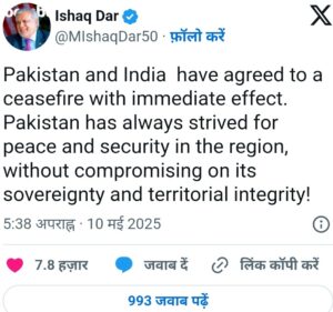 पाकिस्तान के उप प्रधानमंत्री इशाक डार ने अपने X हैंडल पर ऐलान किया कि उनका देश युद्धविराम के लिए तैयार है. उन्होंने अपने पोस्ट में लिखा, ‘पाकिस्तान और भारत ने तत्काल प्रभाव से युद्ध विराम पर सहमति जताई है. पाकिस्तान ने हमेशा अपनी संप्रभुता और क्षेत्रीय अखंडता से समझौता किए बिना क्षेत्र में शांति और सुरक्षा के लिए प्रयास किया है.’