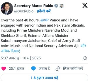 डोनाल्ड ट्रंप के अलावा अमेरिकी विदेश सचिव मार्को रुबियो ने भी सोशल मीडिया मंच एक्स पर लिखा. उन्होंने लिखा- अमेरिकी की विदेश मंत्री ने पिछले 48 घंटों में अमेरिकी उपराष्ट्रपति जेडी वेंस और मैंने प्रधानमंत्री नरेंद्र मोदी और शहबाज शरीफ, विदेश मंत्री सुब्रह्मण्यम जयशंकर, सेना प्रमुख असीम मुनीर और राष्ट्रीय सुरक्षा सलाहकार अजीत डोभाल और असीम मलिक सहित वरिष्ठ भारतीय और पाकिस्तानी अधिकारियों से बातचीत की है.