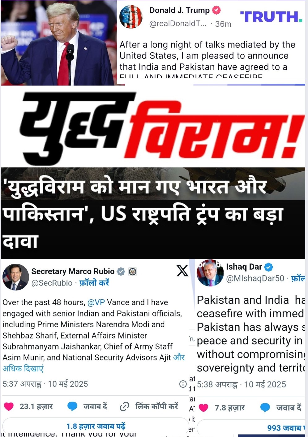 भारत-पाकिस्तान युद्ध विराम को तैयार हो गए हैं. डोनाल्ड ट्रम्प ने सोशल मीडिया मंच TRUTH पर इस बात का दावा करते हुए लिखा कि अमेरिका ने मध्यस्थता करते हुए देर रात तक बात की. मुझे ये बताते हुए बहुत खुशी हो रही है कि भारत और पाकिस्तान तुरंत और पूरी तरह युद्धविराम को राजी हो गए हैं. मैं दोनों देशों को अपना कॉमन सेंस और बुद्धिमत्ता इस्तेमाल करने कौ बधाई देता हूं. इस विषय पर ध्यान देने के लिए आपका शुक्रिया.