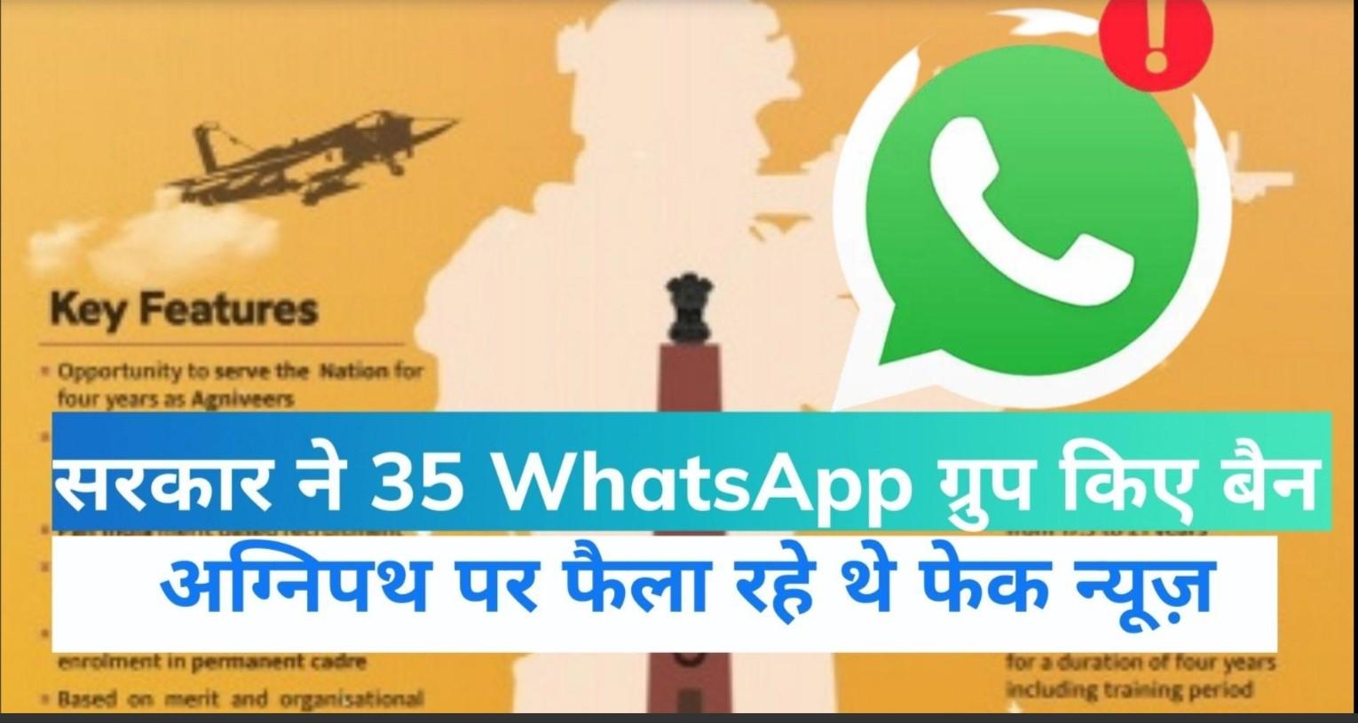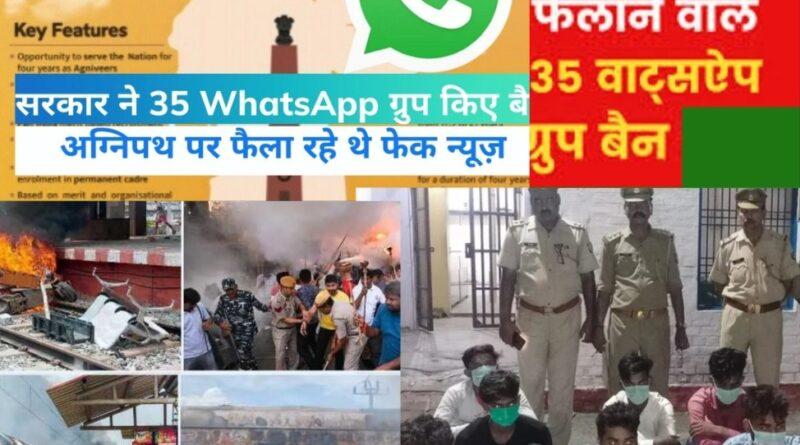 पटना/हैदराबाद 19 जून। अग्निपथ स्कीम पर फेक न्यूज फैलाने वाले 35 वॉट्सऐप ग्रुप पर केंद्र सरकार ने बैन लगा दिया है। सरकारी सूत्रों ने बताया कि इन ग्रुप्स पर अग्निपथ स्कीम को लेकर भ्रामक मैसेज फैलाए जा रहे थे। हालांकि इन ग्रुप्स के एडमिन पर क्या एक्शन ली गई ये अभी स्पष्ट नहीं है। यह एक्शन गृह मंत्रालय ने लिया है।