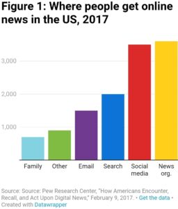 जब उनसे पूछा गया कि उन्हें पिछले दो घंटों में ऑनलाइन समाचार कहाँ से मिला, तो 36 प्रतिशत ने समाचार संगठन की वेबसाइट या ऐप बताया; 35 प्रतिशत ने सोशल मीडिया (जिसका आमतौर पर मतलब किसी समाचार संगठन से पोस्ट होता है, लेकिन यह किसी मित्र की टिप्पणी भी हो सकती है); 20 प्रतिशत ने सर्च इंजन; 15 प्रतिशत ने समाचार संगठन के ईमेल, टेक्स्ट या अलर्ट का संकेत दिया; 9 प्रतिशत ने कहा कि यह कोई अन्य स्रोत था; और 7 प्रतिशत ने परिवार के सदस्य के ईमेल या टेक्स्ट का नाम लिया (चित्र 1 देखें)।