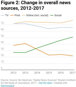 कुल मिलाकर समाचार के स्रोतों में समय के साथ बदलाव हुए हैं। चित्र 2 में 2012 से 2017 के परिणाम दिखाए गए हैं। यह दर्शाता है कि सबसे बड़ा लाभ सोशल मीडिया पर निर्भरता में हुआ है। 2012-2013 में, 27 प्रतिशत लोग सोशल मीडिया साइटों पर निर्भर थे, जबकि 2017 में 51 प्रतिशत लोग ऐसा करते थे।