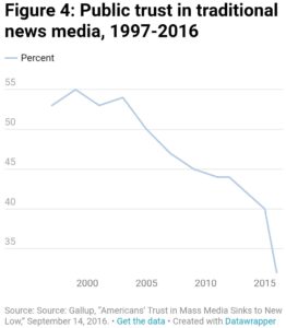 संयुक्त राज्य अमेरिका में, पारंपरिक पत्रकारिता में लोगों का भरोसा घट रहा है। गैलप पोल ने पिछले दो दशकों में कई अमेरिकियों से पूछा कि उन्हें समाचारों को पूरी तरह, सटीक और निष्पक्ष रिपोर्ट करने वाले मास मीडिया पर कितना विश्वास है। जैसा कि चित्र 4 में दिखाया गया है, यह कहने वाले लोगों का प्रतिशत कि उन्हें बहुत ज़्यादा या उचित मात्रा में भरोसा था, 1997 में 53 प्रतिशत से घटकर 2016 में 32 प्रतिशत हो गया।