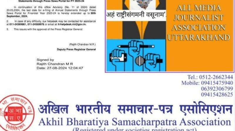 देहरादून 27 अगस्त । भारत के पत्रो के महापंजीयक ने अभासपए तथा अमजा उत्तराखण्ड के अनुरोध पर प्रकाशकों के लिए वार्षिक विवारणी की ई-फाइलिंग की अंतिम तिथि 30 सितंबर 2024 तक बढ़ा दी है। इससे भारत भर के पत्र प्रकाशकों को सुविधा हो गई है।