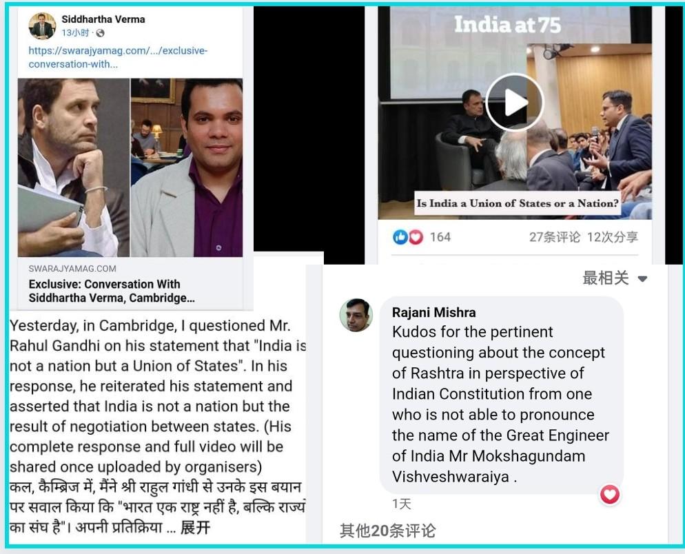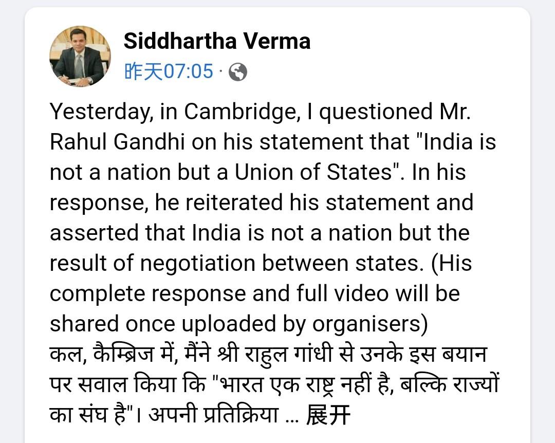 Yesterday, in Cambridge, I questioned Mr. Rahul Gandhi on his statement that "India is not a nation but a Union of States". He asserted that India is not a nation but the result of negotiation between states. (His complete response will be shared once uploaded by organisers) pic.twitter.com/q5KluwenMf