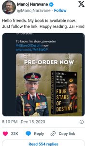 नई दिल्ली,10 फरवरी 2026,पूर्व आर्मी चीफ मनोज नरवणे की विवादित किताब Four Stars Of Destiny से जुड़े दो ट्वीट्स परस्पर विरोधी दिखते हैं. पहले दिसंबर 2023 के ट्वीट में जनरल मनोज नरवणे ने लिखा, ‘हैलो फ्रेंड्स. मेरी किताब अब उपलब्ध है. लिंक फॉलो करो. हैप्पी रीडिंग. जय हिंद.’