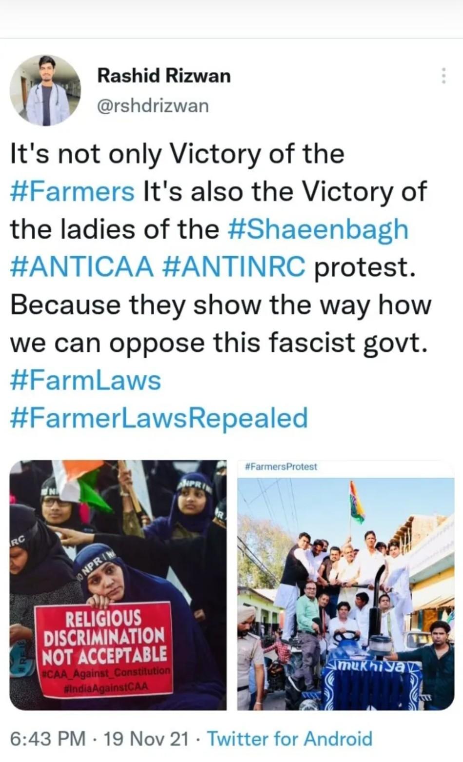 यूक्रेन में रहते हुए रिजवान ने एक भी मौका ऐसा नहीं छोड़ा जब वो भारत विरोधी माहौल बना सके। किसान आंदोलन के समय उसने कहा था कि ये जीत सिर्फ किसानों की नहीं शाहीन बाग के प्रदर्शनकारियों की है।