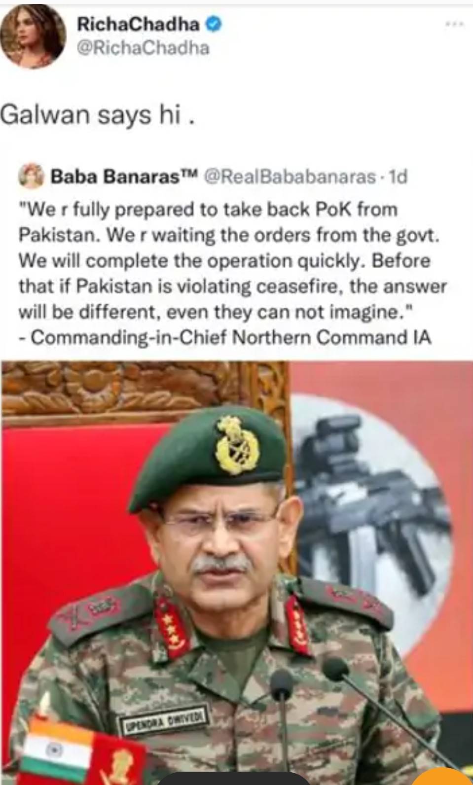 22 नवंबर को नॉर्दन आर्मी के कमांडर लेफ्टिनेंट जनरल उपेंद्र द्विवेदी ने ट्वीट किया। जिस पर ऋचा ने अगले दिन री-ट्वीट किया था।