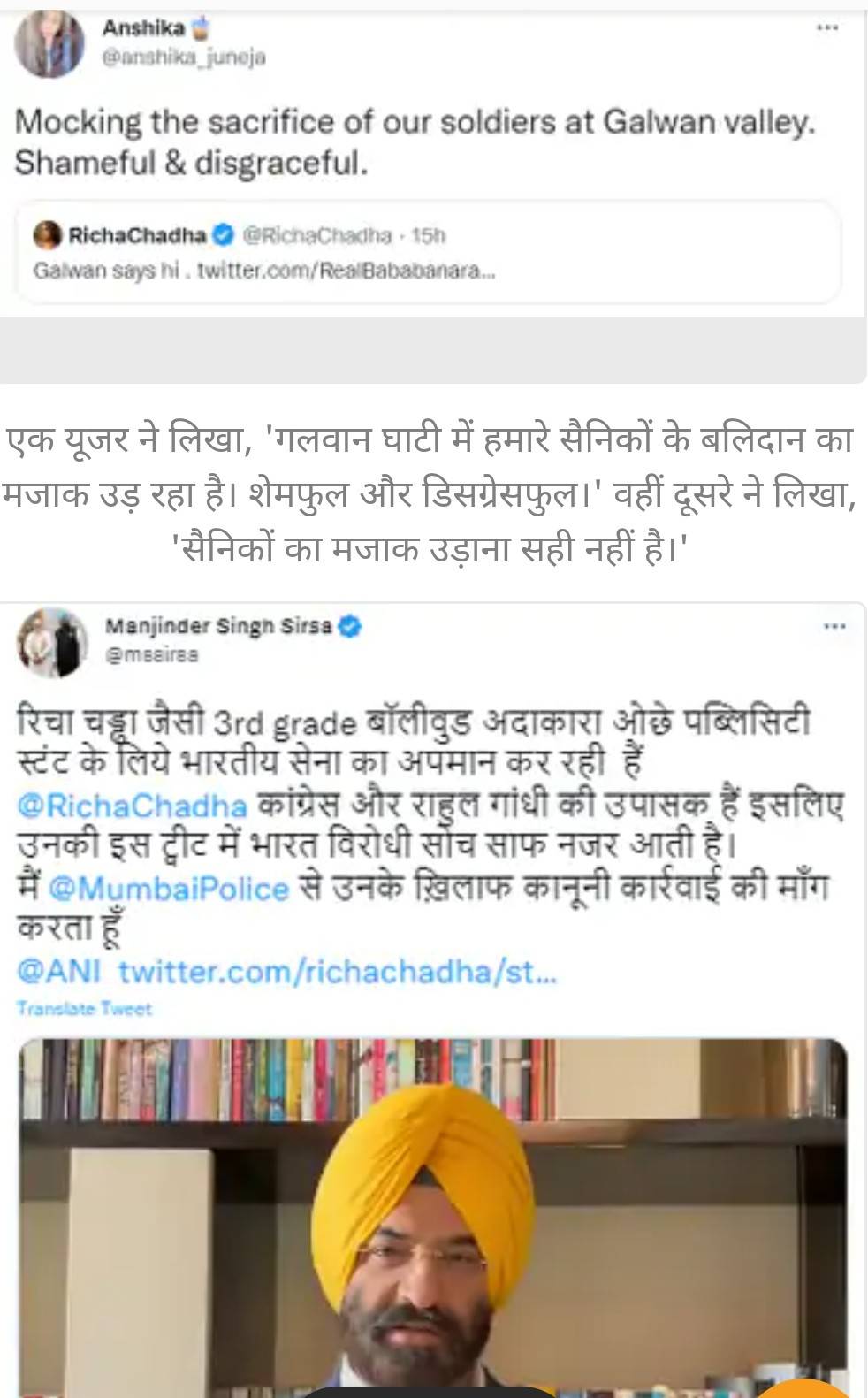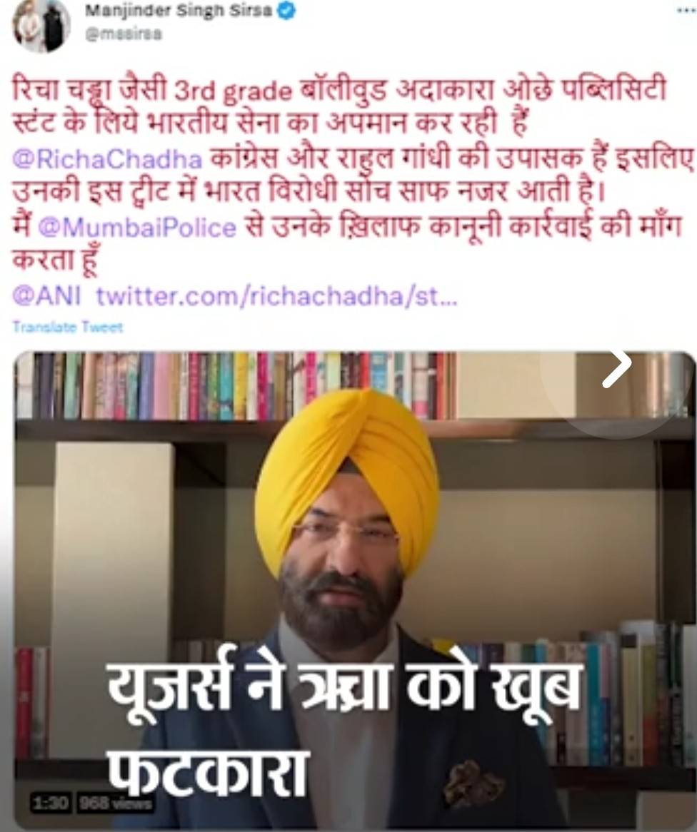 ऋचा के ट्वीट के बाद BJP नेता मनजिंदर सिंह ने गुरुवार को एक वीडियो शेयर किया।