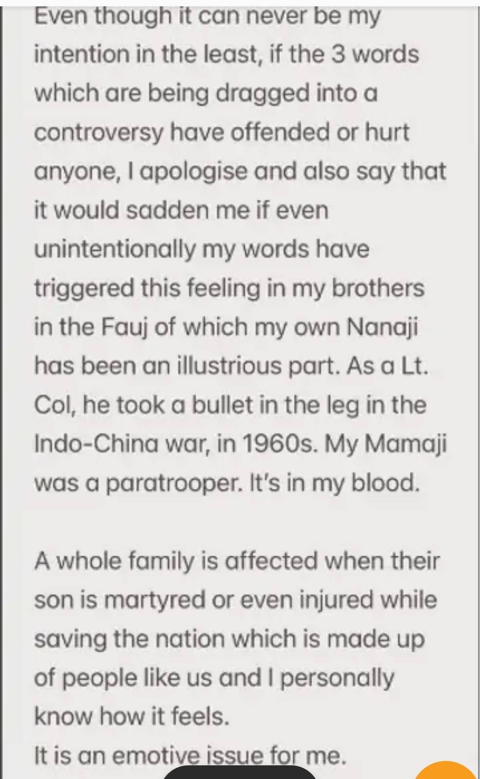 मेरे नाना जी खुद फौज में थे और लेफ्टिनेंट कर्नल की पोस्ट पर थे। 1960 में भारत-चीन की लड़ाई में उनके पैर में गोली लगी थी। मेरे मामा जी भी पैराट्रूपर थे। ये मेरे खून में है। अगर सेना में कोई शहीद होता है तो उससे पूरी फैमिली अफेक्ट होती है। यहां तक कि अगर कोई सेना में घायल होता है तो भी दर्दनाक होता है। ये मेरे लिए एक भावनात्मक मुद्दा है।’