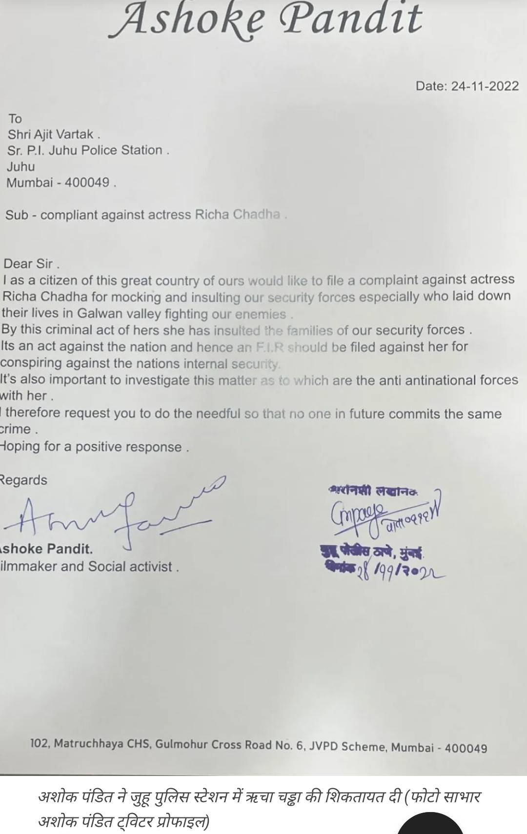 उधर फिल्ममेकर अशोक पंडित ने तो ऋचा चड्ढा के खिलाफ पुलिस में शिकायत भी दे दी है। कंप्लेन जुहू पुलिस थाने में की गई है। अपनी शिकायत में निर्माता ने अभिनेत्री के ट्वीट को क्रिमिनल एक्ट बताया है। अपनी शिकायत में उन्होंने कहा, “मैं हमारे इस महान देश के एक नागरिक के रूप में अभिनेत्री ऋचा चड्ढा के खिलाफ हमारे सुरक्षा बलों का मजाक उड़ाने और अपमान करने के लिए शिकायत दर्ज कराना चाहूँगा। खासकर जिन्होंने गलवान घाटी में हमारे दुश्मनों से लड़ते हुए अपनी जान कुर्बान कर दी।” उन्होंने लिखा है कि ऋचा के खिलाफ जरुरी कार्रवाई करें, ताकि भविष्य में कोई भी ऐसा अपराध न करे। सकारात्मक जवाब का इंतजार है।