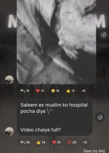 ग्रुप पर सलीम का गला कटा फोटो प्रसारित कर लिखा गया सलीम एक्स मुस्लिम को अस्पताल पहुंचा दिया गया है, वीडियो चाहिए फुल? साथ ही सलीम का पर्सनेलिटी फोटो डालकर लिखा गया है कि एक्स मुस्लिम सलीम का इलाज वीडियो सून।