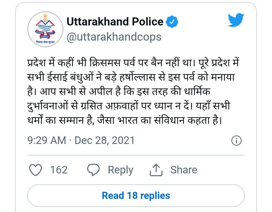ऐसा ट्वीट उन्होंने किया। हालांकि उनकी इस नफरत का उत्तर देने में उत्तराखंड पुलिस ने जरा भी देर नहीं लगाई और स्पष्ट किया कि