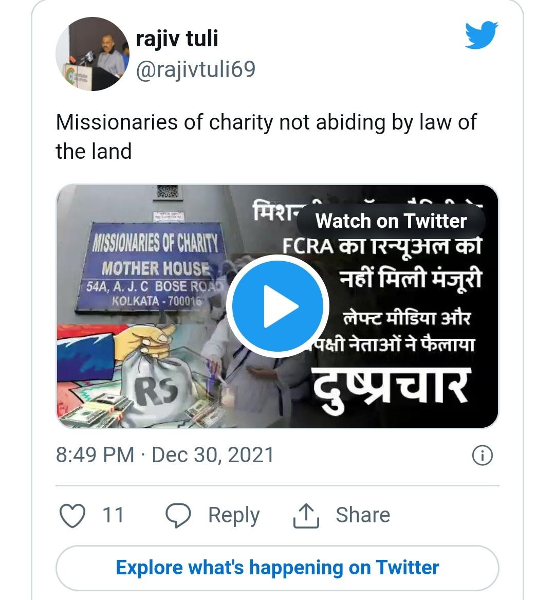 हालांकि मिशनरीज़ ऑफ चेरिटी पर समय समय पर कई आरोपों में घिरी है, और यह मांग भी उठती रही है कि सरकार द्वारा कड़े कदम उठाए जाएं। आज राजीव तुली ने एक वीडियो ट्वीट किया: