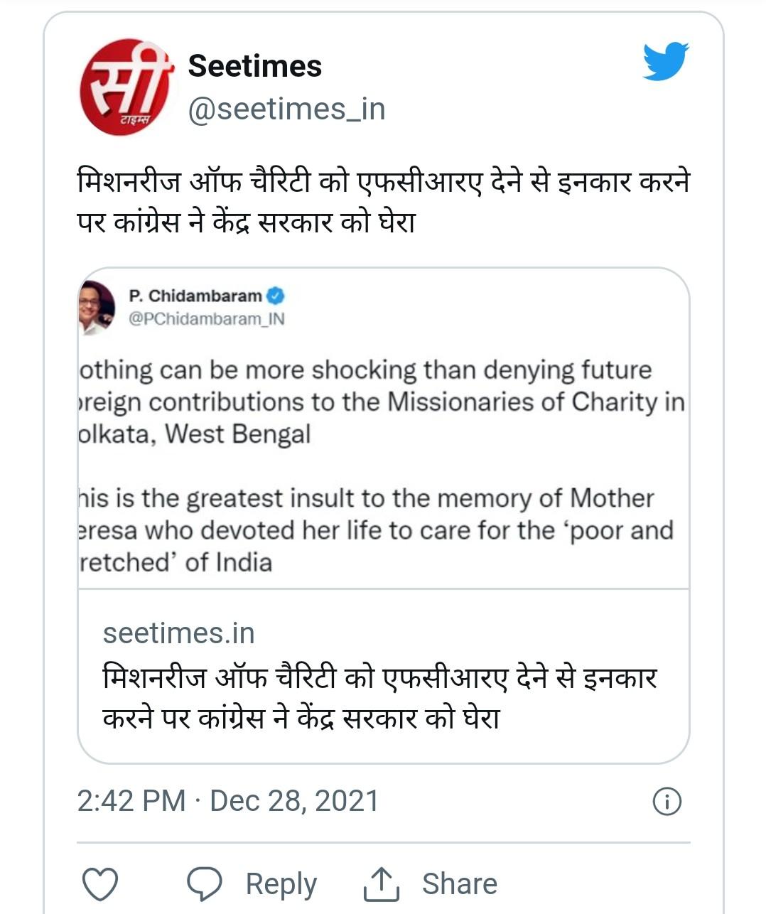 परन्तु गोवा के चुनावों में ईसाई वोटों को ध्यान में रखकर राजनीतिक दांव खेलने की जल्दी में या तो ममता बनर्जी ने यह कहा या फिर राजनीतिक बढ़त बनाने के लिए यह झूठ फैलाया। परन्तु यह झूठ बहुत तेजी से फैला और देखते ही देखते सरकार को घेरने के लिए कांग्रेस से लेकर सभी विपक्षी दल आ गए। बाद में चिदम्बरम ने ने एफसीआरए में देरी देने से इंकार करने पर केंद्र सरकार को घेर लिया था: