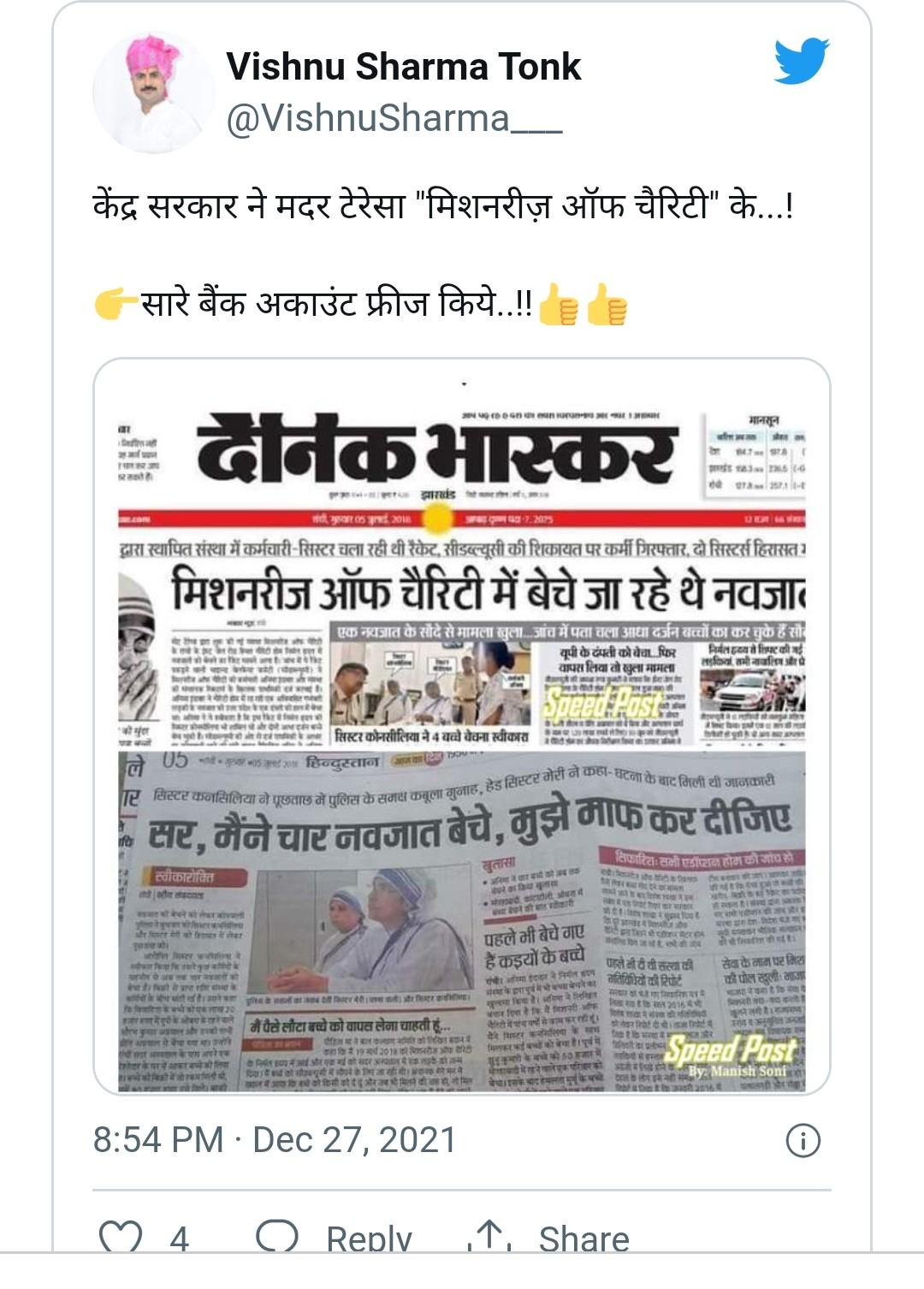 27 दिसम्बर 2021को पश्चिम बंगाल की मुख्यमंत्री ममता बनर्जी ने भारत सरकार पर यह आरोप लगाते हुए सनसनी फैला दी कि मदर टेरेसा की मिशनरी ऑफ इंडिया के खातों को भारत सरकार द्वारा फ्रीज़ कर दिया गया है। और देखते ही देखते यह खबर वायरल हो गयी।