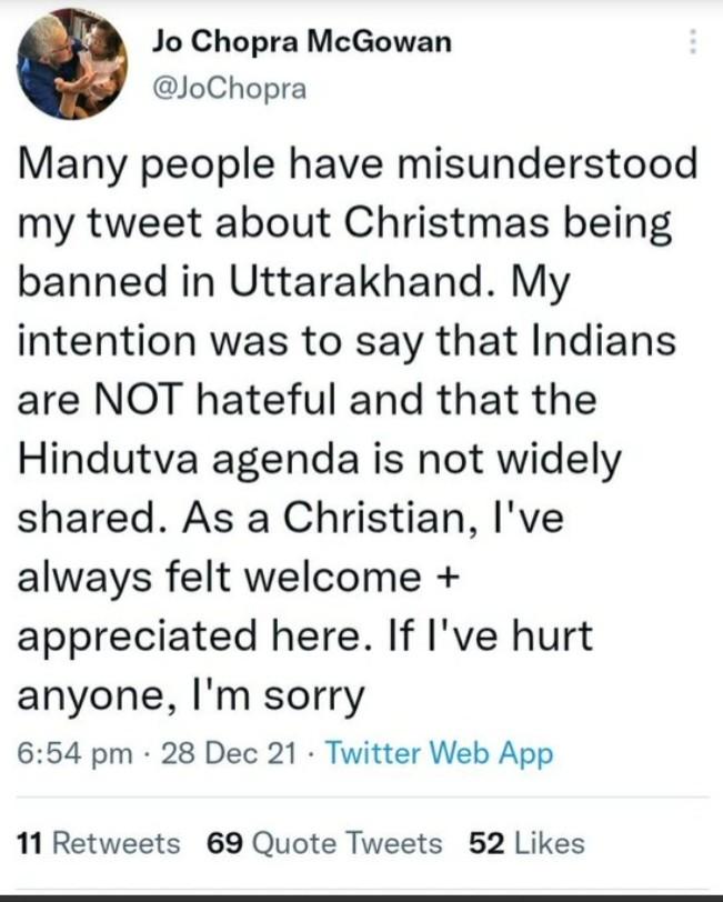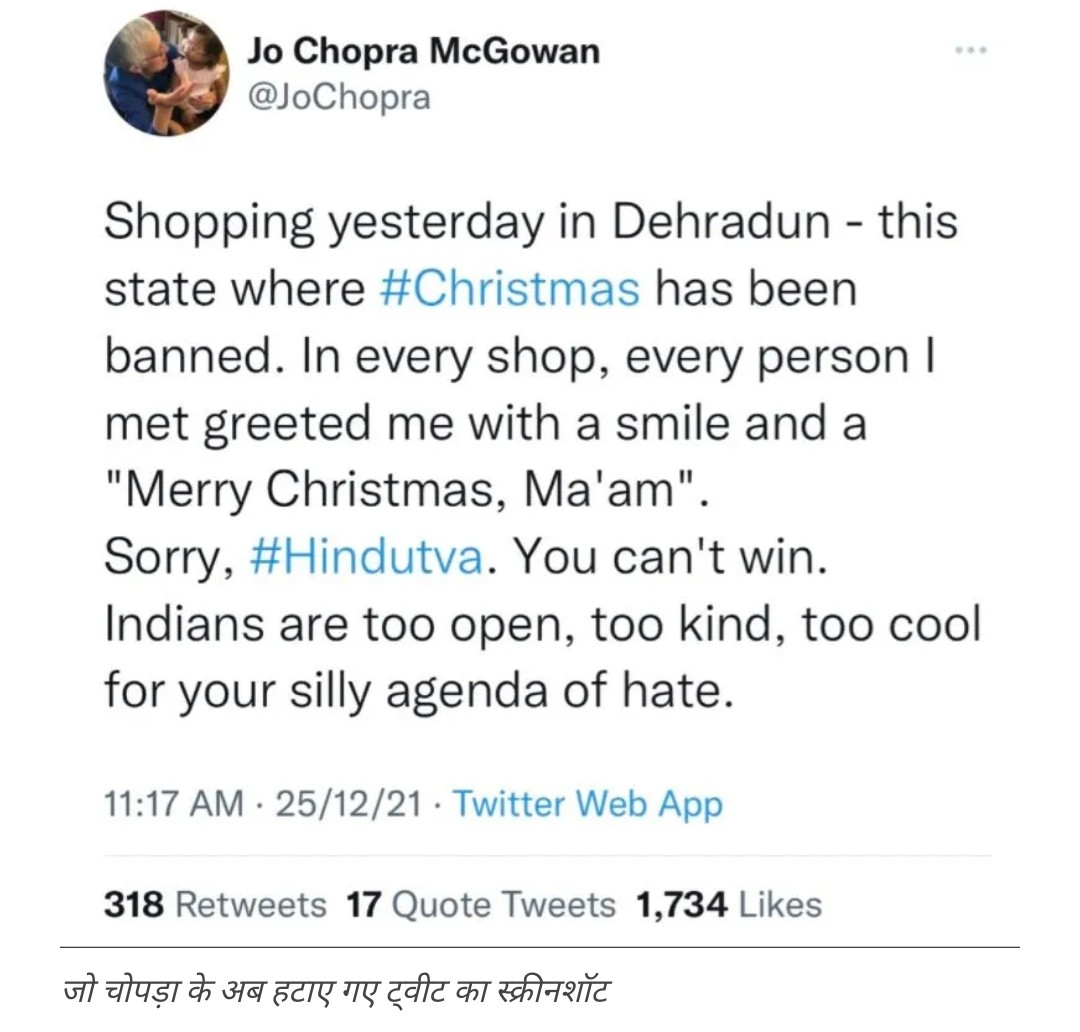 “देहरादून में शौपिंग कर रही थी। यह वह राज्य है जहाँ पर क्रिसमस पर प्रतिबन्ध है। हर दुकान, हर व्यक्ति जिसका मैंने अभिवादन किया, वह मुस्कराकर मेरी क्रिसमस कहता हुआ मिला! सॉरी हिंदुत्व, तुम जीत नहीं सकते! भारतीय बहुत खुले हैं, कूल हैं और तुम्हारे एजेंडे के पीछे वह नहीं आएँगे!”