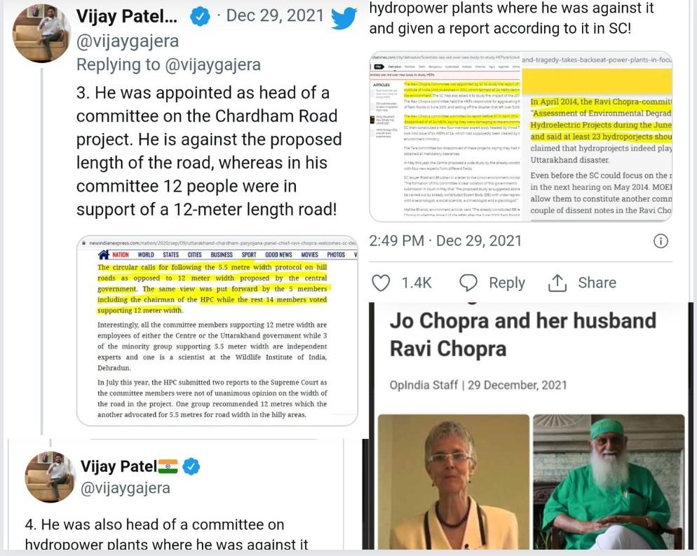 और यह भी मीडिया में है कि कैसे रवि चोपड़ा ने चारधाम को चौड़ा करने की योजना का विरोध किया था और उच्चतम न्यायालय ने जो समिति उनके नेतृत्व में बनाई थी उसमें उन्होंने ही सड़क के चौड़ीकरण का विरोध किया था।