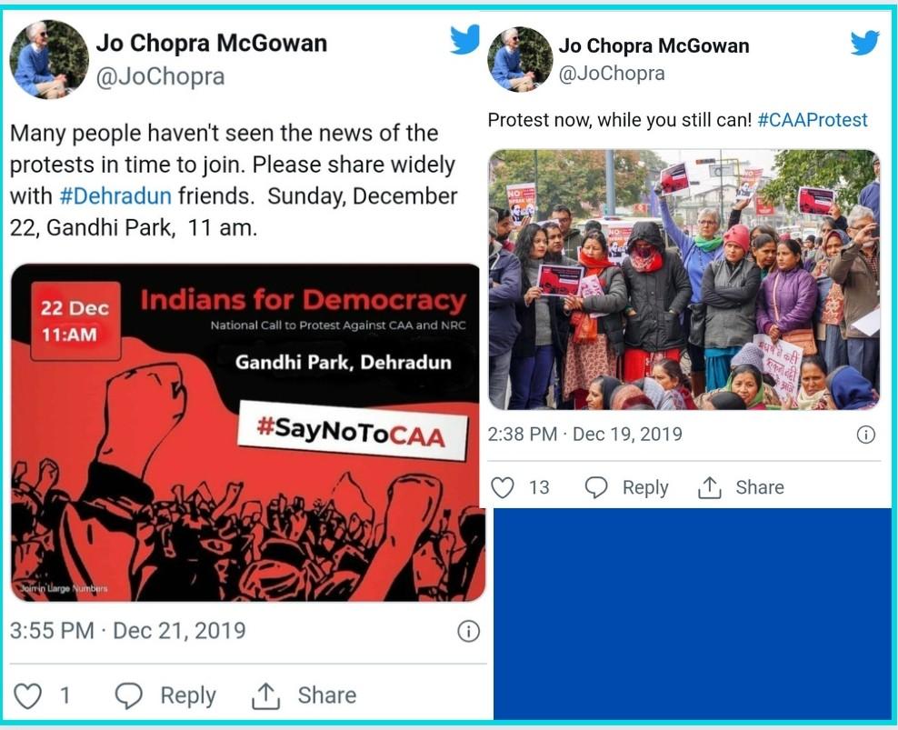 हालांकि जो चोपड़ा खुद भारत की नहीं हैं, परन्तु भारत के आतंरिक मामलों में हस्तक्षेप करना उनकी आदत है और नरेंद्र मोदी की कट्टर विरोधी हैं। और वह भारत के लोगों को नागरिकता कानून के खिलाफ भड़का चुकी हैं, और लोगों से अनुरोध कर चुकी हैं कि वह इस कानून का विरोध करे।