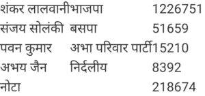 – शंकर लालवानी- 9 लाख 50 हजार वोट प्राप्त कर चुके . उनके मुकाबले बसपा के संजय को 40 हजार वोट मिले जबकि NOTA को अब तक 1 लाख 65 हजार वोट मिले हैं.