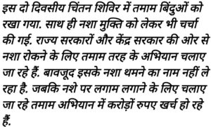 दो दिवसीय राष्ट्रीय चिंतन शिविर में राज्यों के कैबिनेट मंत्रियों ने तेजी से फैलते नशे की रोकथाम पर विशेष जोर दिया. मंत्रियों ने कहा कि नशा जड़ से समाप्त करने को भारत सरकार कोई ऐसा कानून बनाए कि कोई नशा तस्कर पकड़ा जाए तो उसके परिवार को सरकारी योजनाओं और सरकारी नौकरियों से वंचित रखा जाए. साथ ही उसे अधिकाधिक सजा दी जाए. क्योंकि नशा मुक्ति अभियान में राज्य और केंद्र सरकार करोड़ों रुपए खर्च करती है. लेकिन उसका कोई असर धरातल पर दिख नहीं रहा है. ऐसे में राज्य और केंद्र सरकारों को कोई ठोस कदम उठाने की जरूरत है.