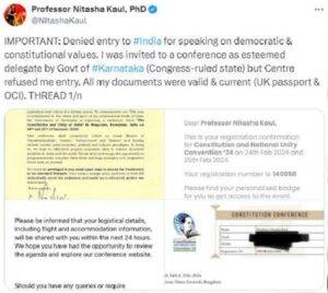 बेंगलुरु 27 फरवरी 2024। UK की भारतीय मूल की प्रोफेसर निताशा कौल को शिकायत है कि उन्हें बेंगलुरु एयरपोर्ट पर लैंड करते ही वापस भेज दिया गया। निताशा कर्नाटक सरकार के न्योते पर एक कार्यक्रम को बेंगलुरु आई थीं।