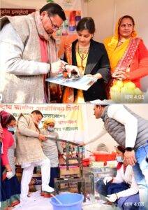 रूरल बिजनेस इंक्यूबेटर की ओर से लगे स्टॉल पर शिल्पकार के उद्यमियों एवं स्वास्तिक स्वयं सहायता की महिलाओं के साथ मिलकर मुख्यमंत्री धामी ने स्टोन पेन्टिंग करते हुए उनकी संस्था की जानकारी ली। वहीं उन्नती क्लस्टर संगठन, कालीमठ कोटमा की महिलाओं के स्टॉल पर कताई एवं बुनाई की। संगठन की अध्यक्ष सरिता देवी ने उन्हें हाथकरघा की पूरी विधि बताते हुए अपने संगठन की जानकारी दी। उन्होंने समूह के उत्पादों की सराहना करते हुए श्री केदारनाथ धाम एवं यात्रा मार्ग पर भी आउटलेट खोलने एवं पारंपरिक तरीके से बन रहे दोखे, शौल, टोपी आदि का खूब प्रचार करने को कहा।