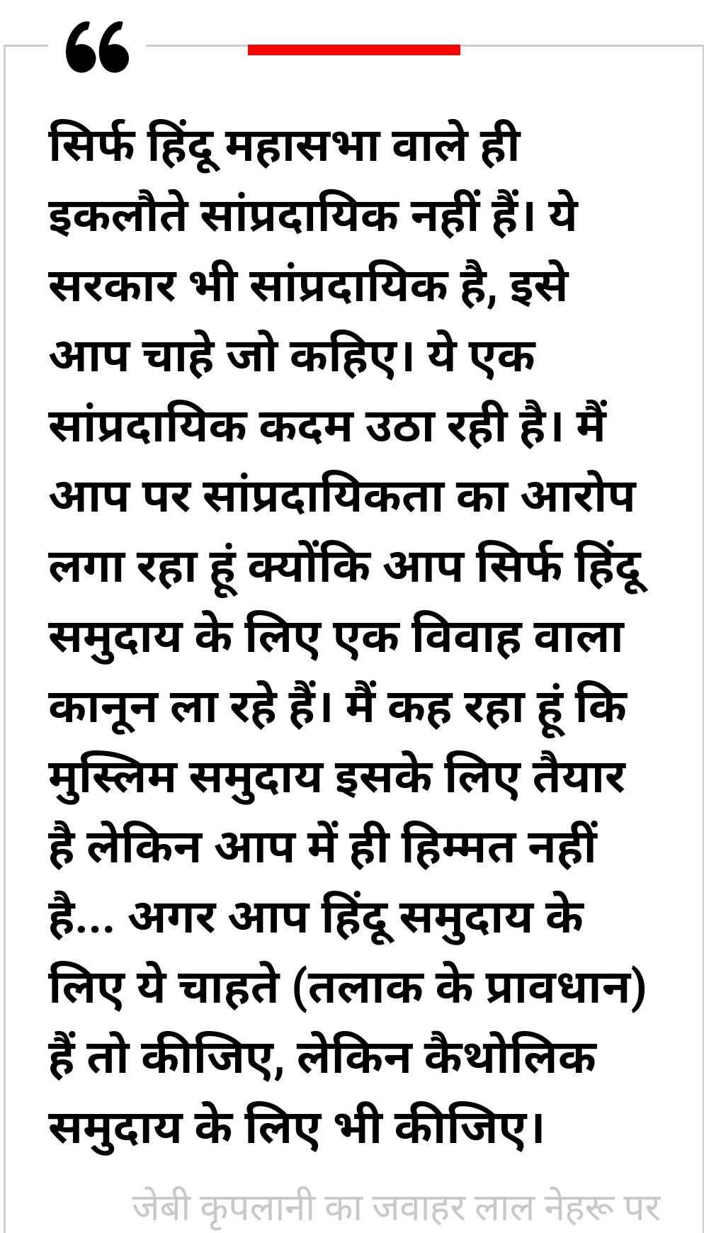 सिर्फ हिंदू महासभा वाले ही इकलौते सांप्रदायिक नहीं हैं। ये सरकार भी सांप्रदायिक है, इसे आप चाहे जो कहिए। ये एक सांप्रदायिक कदम उठा रही है। मैं आप पर सांप्रदायिकता का आरोप लगा रहा हूं क्योंकि आप सिर्फ हिंदू समुदाय के लिए एक विवाह वाला कानून ला रहे हैं। मैं कह रहा हूं कि मुस्लिम समुदाय इसके लिए तैयार है लेकिन आप में ही हिम्मत नहीं है… अगर आप हिंदू समुदाय के लिए ये चाहते (तलाक के प्रावधान) हैं तो कीजिए, लेकिन कैथोलिक समुदाय के लिए भी कीजिए।