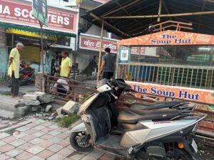 “The Soup Hut”, “Ayush Nursery (The Green Company)”, और अन्य ढाबे-पोस्टर स्पष्ट दर्शाते हैं कि यह जगह अब पार्किंग के बजाए व्यावसायिक उपयोग में लाई जा रही है।