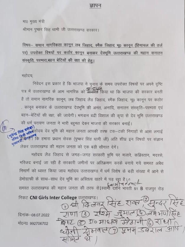 ज्ञापन के अनुसार लैंड जिहाद में जगह- जगह सरकारी भूमि घेर कर मजार, कब्रिस्तान, मदरसे और मस्जिद बनाई जा रही हैं। प्रतिनिधिमंडल ने मांग की कि सरकारी जमीनों पर अतिक्रमण करके बनाये गये ऐसे सभी अवैध निर्माण तत्काल ध्वस्त किए जायें। उन्होंने कहा कि संप्रदाय विशेष के लोग योजनापूर्वक उत्तरांखड में बसा कर इस सीमांत प्रदेश की भूसांख्यिकी (डेमोग्राफी) बदली जा रही है। इससे देवभूमि उत्तराखंड का युगों-युगों से संरक्षित देवचरित्र और पहचान संकट में पड़ गया है।