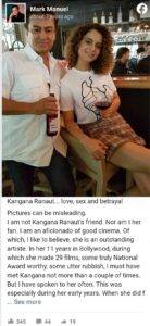 सितंबर 15, 2017 को शेयर की गई तस्वीर के साथ लिखे लंबे पोस्ट में मार्क मैनुअल ने जानकारी देते हुए लिखा कि यह तस्वीर कुछ महीने बाद कंगना की फ़िल्म ‘सिमरन’ का जश्न मनाने के लिए शैंपेन ब्रंच के दौरान खार (मुंबई) के कॉर्नर हाउस में ली गई थी.