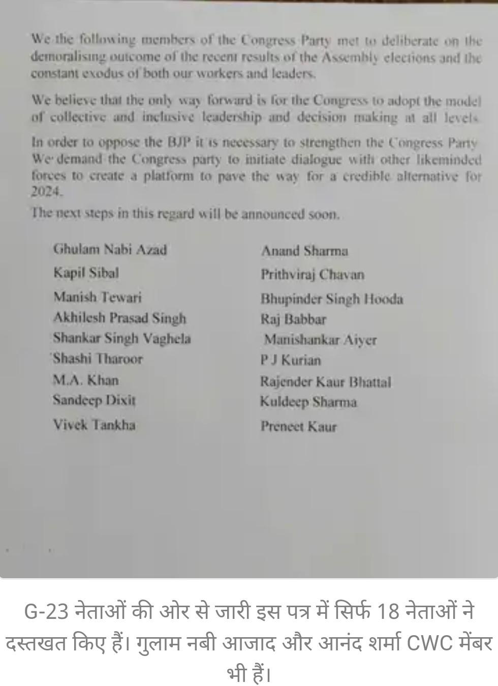 G-23 नेताओं की ओर से जारी इस पत्र में सिर्फ 18 नेताओं ने दस्तखत किए हैं। गुलाम नबी आजाद और आनंद शर्मा CWC मेंबर भी हैं।