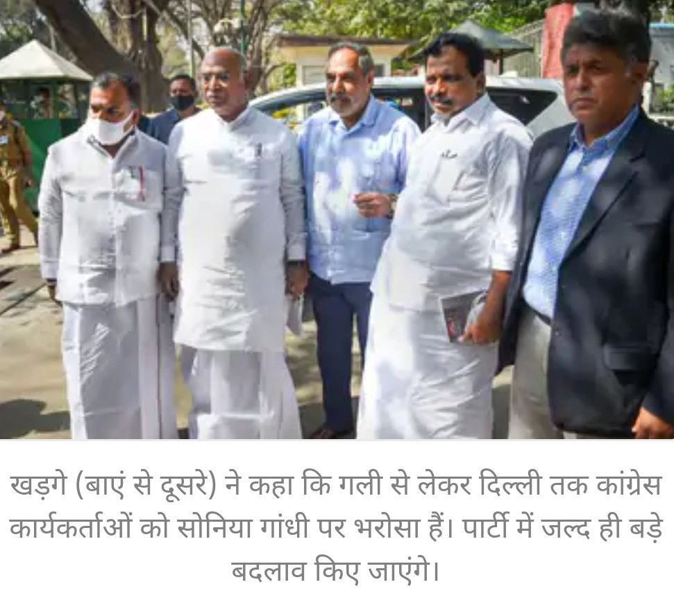 खड़गे (बाएं से दूसरे) ने कहा कि गली से लेकर दिल्ली तक कांग्रेस कार्यकर्ताओं को सोनिया गांधी पर भरोसा हैं। पार्टी में जल्द ही बड़े बदलाव किए जाएंगे।