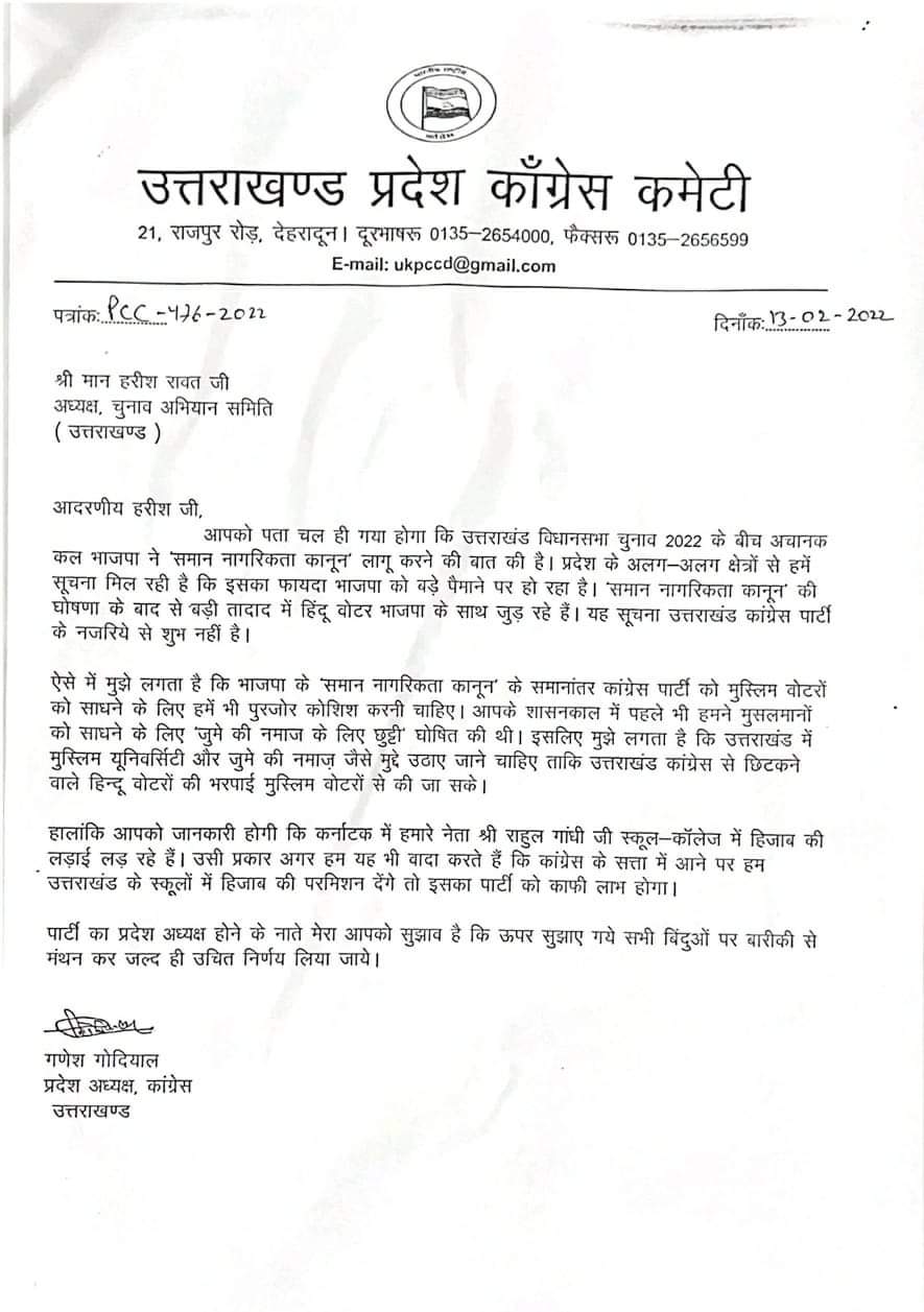 महासचिव जोशी संगठन एवं महानगर अध्यक्ष लालचन्द शर्मा ने मुख्य निर्वाचन अधिकारी कार्यालय में मुलाकात कर निर्वाचन आयोग को शिकायती पत्र तथा सोशल मीडिया पर प्रदेश कांग्रेस अध्यक्ष गणेश गोदियाल के डुप्लिकेट हस्ताक्षर से चलाये जा रहे फर्जी पत्र को सौंपते हुए कहा कि कुछ असामाजिक तत्वों द्वारा विधानसभा चुनाव को प्रभावित करने की दृष्टि से प्रदेश कांग्रेस कमेटी के फर्जी लेटर हैड पर अध्यक्ष गणेश गोदियाल के डुप्लिकेट हस्ताक्षरों से समान नागरिकता कानून को मुद्दा बनाते हुए सोशल मीडिया के माध्यम से झूठी अफवाह फैलाकर जनता को भ्रमित करने का प्रयास किया जा रहा है। असामाजिक तत्वों की इस हरकत से कांग्रेस पार्टी की छबि को धूमिल करने के साथ ही विधानसभा चुनाव में धर्म के आधार पर समाज को बांट कर चुनाव को प्रभावित करने का प्रयास किया जा रहा है जो कि आदर्श चुनाव आचार संहिता का खुला उलंघन है। ऐसा करने वाले लोगों के खिलाफ सक्षम धाराओं में मुकदमा दर्ज करते हुए कठोर कार्रवाई की जानी चाहिए