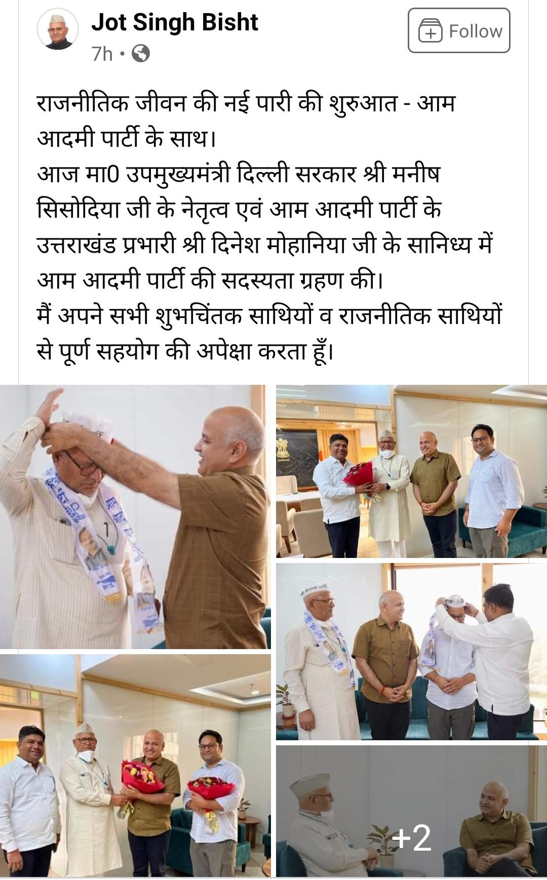 कांग्रेस के प्रदेश उपाध्यक्ष जोत सिंह बिष्ट अपने पुत्र हेमंत बिष्ट के साथ आम आदमी पार्टी में शामिल हो गए। उन्होंने दिल्ली में उप मुख्यमंत्री मनीष सिसोदिया की उपस्थिति में आप की सदस्यता ग्रहण की। बिष्ट ने आज सुबह कांग्रेस छोड़ने की घोषणा की थी।