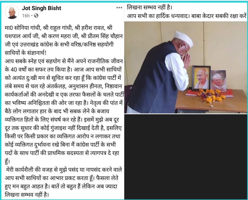 कांग्रेस में अपने 40 वर्षों की यात्रा का जिक्र करते हुए जोत सिंह बिष्ट ने कहा कि लंबे समय से अंतर्कलह, अनुशासनहीनता, निष्ठावान कार्यकर्ताओं की अनदेखी और एकतरफा निर्णयों से पार्टी का भविष्य अनिश्चितता की ओर जा रहा है। नेतृत्व की पांत में बैठे लोग लगातार हार के बाद भी सबक लेने के बजाय व्यक्तिगत हितों के लिए संघर्ष कर रहे हैं। इसमें सुधार की गुंजाइश दूर-दूर तक दिखाई नहीं पड़ रही है।