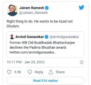 कांग्रेस के नेता और पूर्व केंद्रीय मंत्री जयराम रमेश ने बुद्धदेव भट्टाचार्य के फैसले पर कहा, ‘उन्होंने सही किया. वह गुलाम नहीं आज़ाद बनना चाहते हैं.’